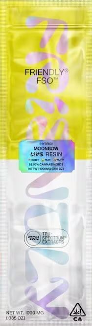 Moonbow 1g Live Resin FSO | Hybrid Palate: sweet, pear, nutty DAB IT! ROLL IT! EAT IT! Introducing FRIENDLY BRAND's Live Resin FSO - the epitome of premium cannabis extraction. Meticulously crafted from freshly harvested, flash-frozen cannabis cultivated by industry-leading growers, our Live Resin FSO encapsulates the essence of the living plant like no other. You are now granted full access to how you consume your cannabis all in one product. Our applicator allows you to measure dosage with precision and enjoy its versatility at your leisure. Consume orally, dab directly, top your flower or add to your preroll or blunt. Each gram of our FSO uses the same TRU Spectrum, strain-specific cannabis oil used in our award winning vapes, ensuring unparalleled value, taste, and potency.
