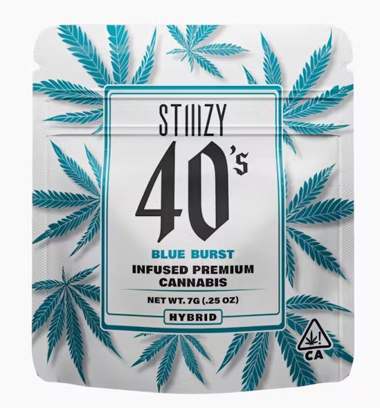 Elevate your flower experience with the new STIIIZY 40’s infused flower. We have expanded our 40’s line by incorporating our premium cannabis flower infused with our finest THC-A Diamonds for an extra punch. We call them 40's because our infused flower strains are potent, testing at 40% total cannabinoids content. Now you can roll your own 40’s with STIIIZY infused flower, the possibilities are endless with unmatched potency. BLUE BURST TASTE: Blue Raspberry, Citrus, Mixed Fruits FEELING: Relaxed, Uplifted, Creative DESCRIPTION: Named for its delicious and powerful flavor, our Blue Burst 40ʼs are known for its blue raspberry flavor with hints of citrus on every exhale. Blue Burst 40ʼs will have you taking flight on a balanced and pleasant cerebral high.